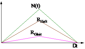 Bild: Stark vereinfachter Verlauf der Kontaktkraft N(t) über das Intervall Δt sowie Verlauf der Reibungskräfte über das Intervall Δt. Für die Berechnung wurde ein konstanter, mittlerer Wert N und RGleit angenommen.