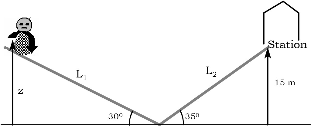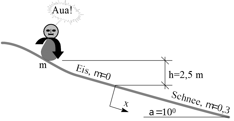 Ein Skifahrer stürzt bei einer Geschwindigkeit von v0 = 2 [m/s] und rutscht auf einer Eisbahn, die eine Neigung von 10 Grad hat, weiter. Er verliert dabei eine Höhendifferenz von 2,5 [m]. An das Eis schließt sich eine Schneepiste an, auf der der Skifahrer nach weiteren x [m] zum Halten kommt. Zwischen dem Skianzug und dem Schnee besteht eine Reibungszahl von
