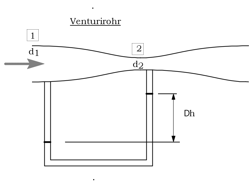 Der Unterschied des statischen Drucks zwischen den Punkten 1 und 2 wird aus dem Wert Δh der Flüssigkeitssäulen ermittelt. In Verbindung mit den Werten des Durchmessers der Rohrleitung an den Stellen 1 und 2 kann die Strömungsgeschwindigkeit mit Hilfe der Bernoulligleichung und daraus der Volumenstrom pro Sekunde bestimmt werden.